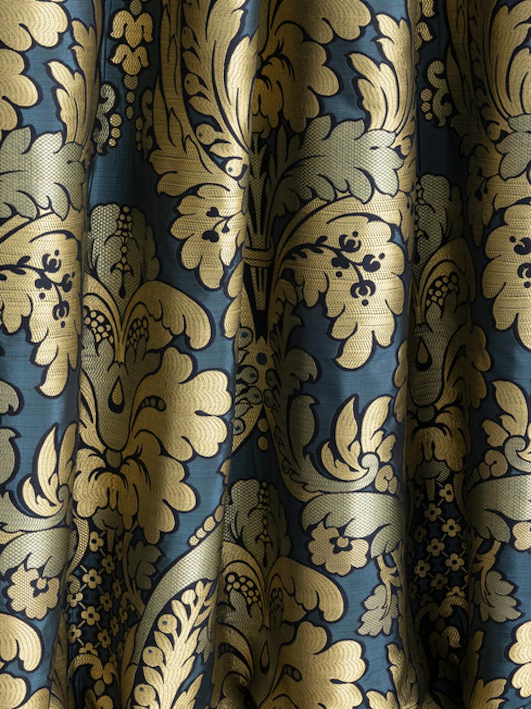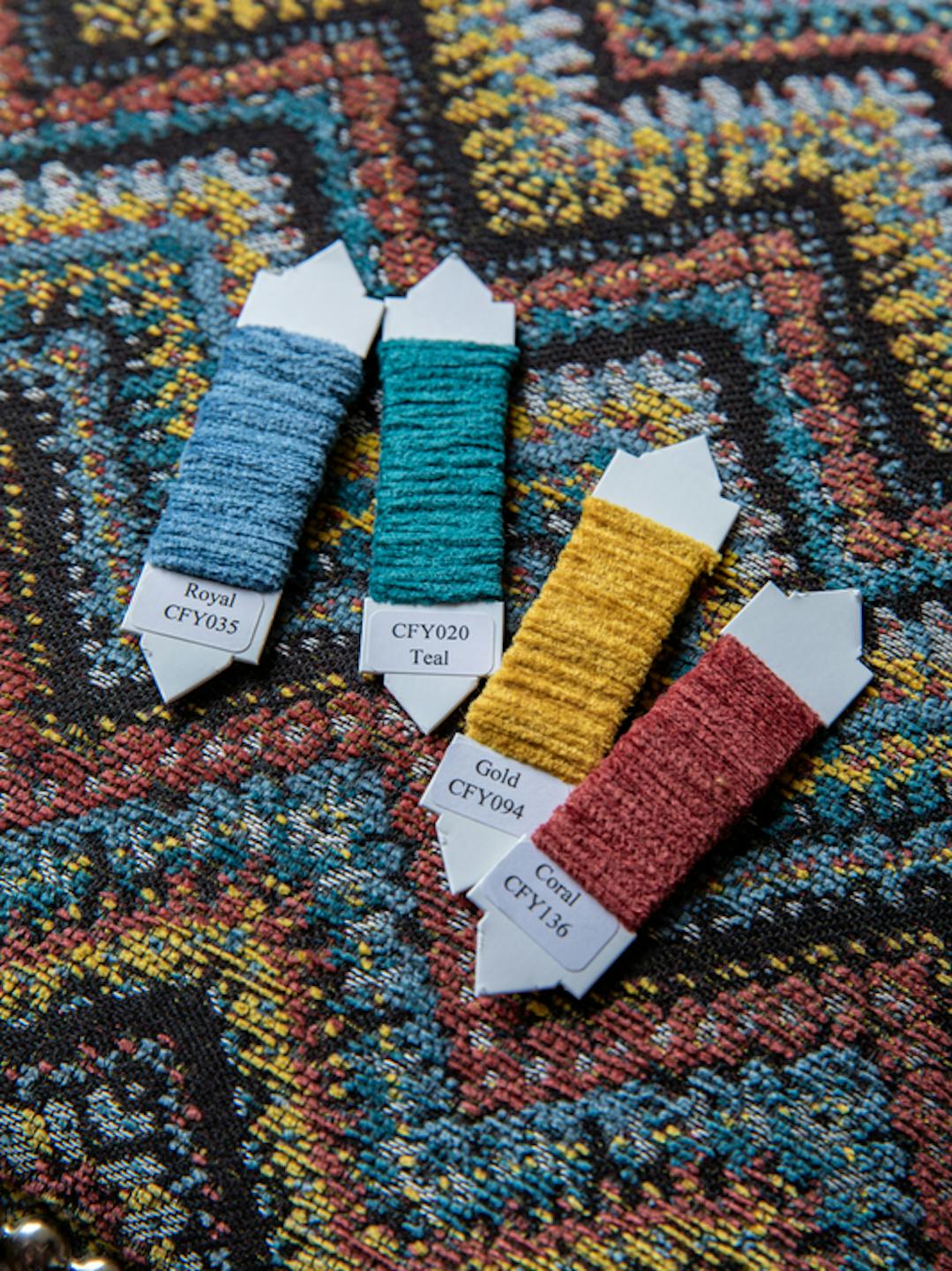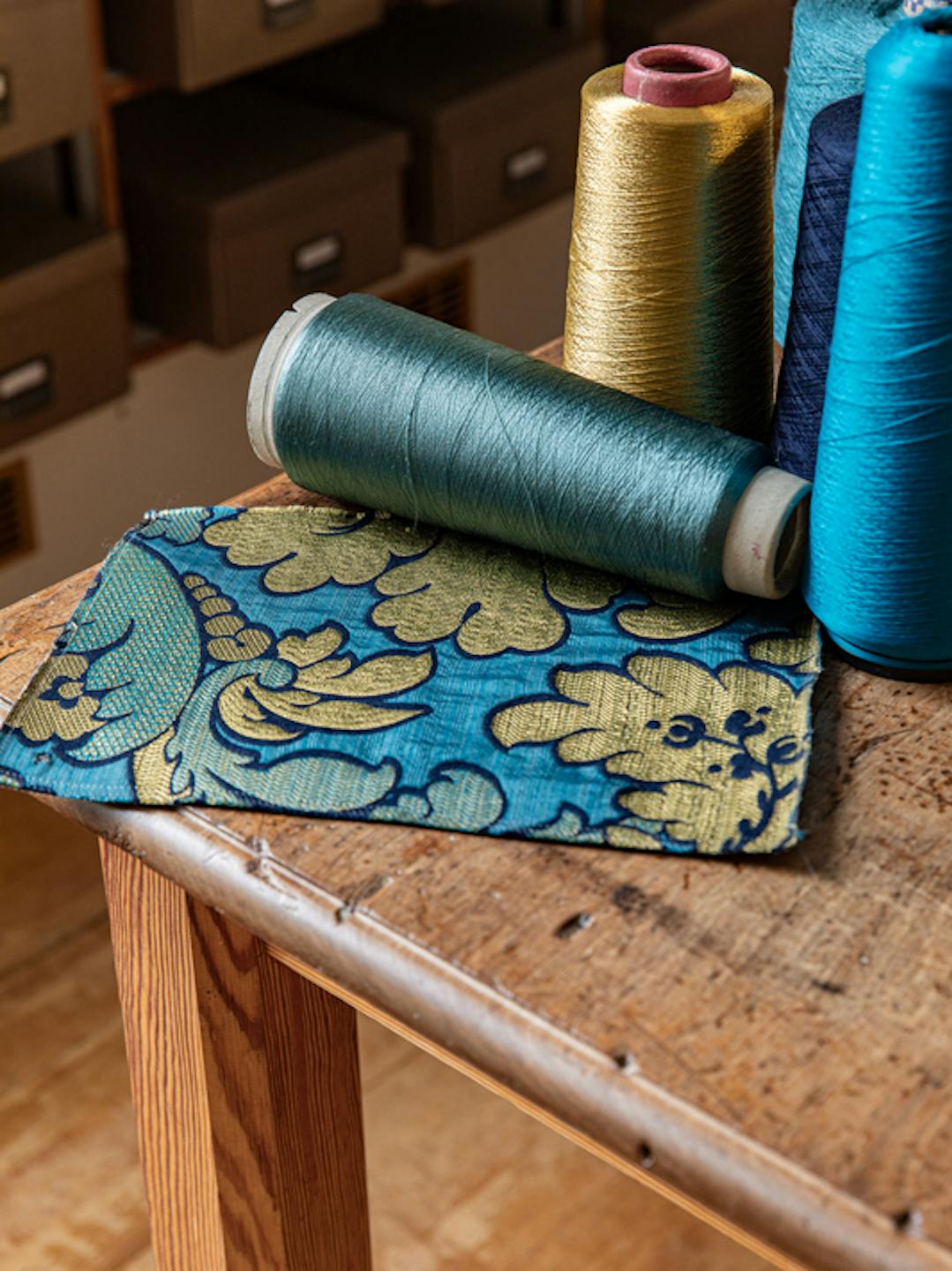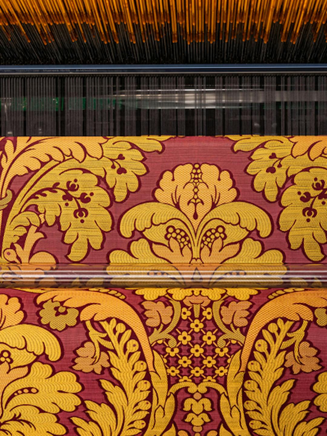 Forte de 121 dessins et 346 références, la collection de jacquards Thorp of London embrasse une grande diversité esthétique : damas et lampas en soie aux structures complexes et à la brillance subtile, motifs floraux, géométriques ou animaliers en coton, lin ou viscose au tombé fluide parfait, velours chenillés aux textures riches et profondes… Tous les modèles sont tissés sur l’une des trois chaînes pré-montées en fils de coton, polyester ou soie déclinées dans trois coloris (noir, blanc ou beige), elles-mêmes tramées dans une variété de sept types de fils différents : coton, lin, laine, soie, chenille, viscose ou polyester.
